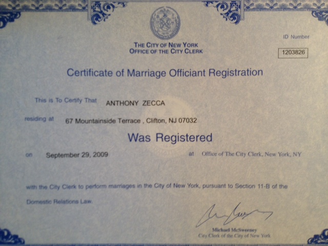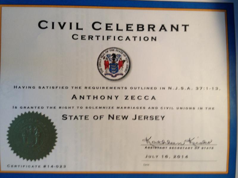 I am a non-denominational officiant/minister licensed and certified to perform marriage ceremonies throughout the state of New Jersey and New York.